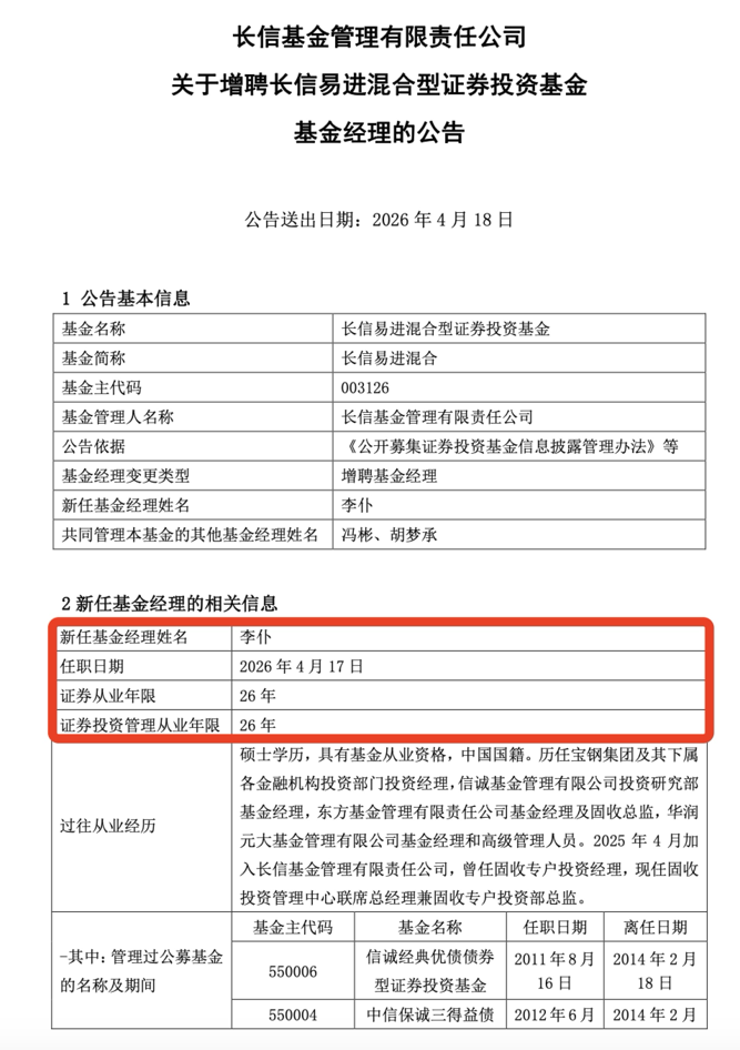 最新公告显示,李仆于2025年4月加入长信基金,曾任固收专户投资经理,现任固收投资管理中心联席总经理兼固收专户投资部总监。如今伴随着增聘,李仆开始重新回归公募领域。