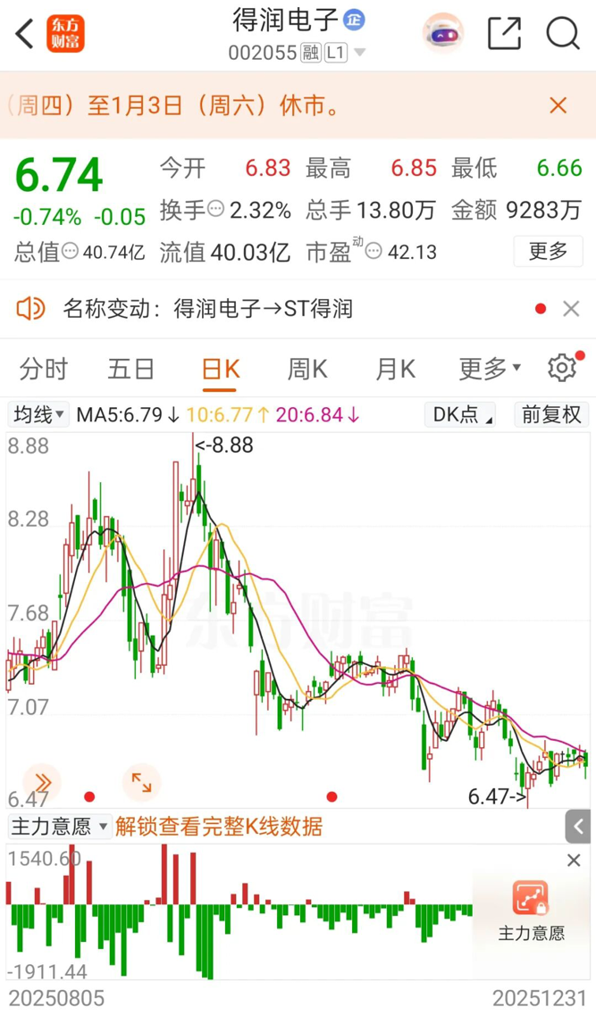 根据深交所相关规定,公司股票将于2026年1月5日停牌一天,自1月6日起复牌,并被实施其他风险警示,股票简称变更为“ST得润”,股票交易日涨跌幅限制变为5%。