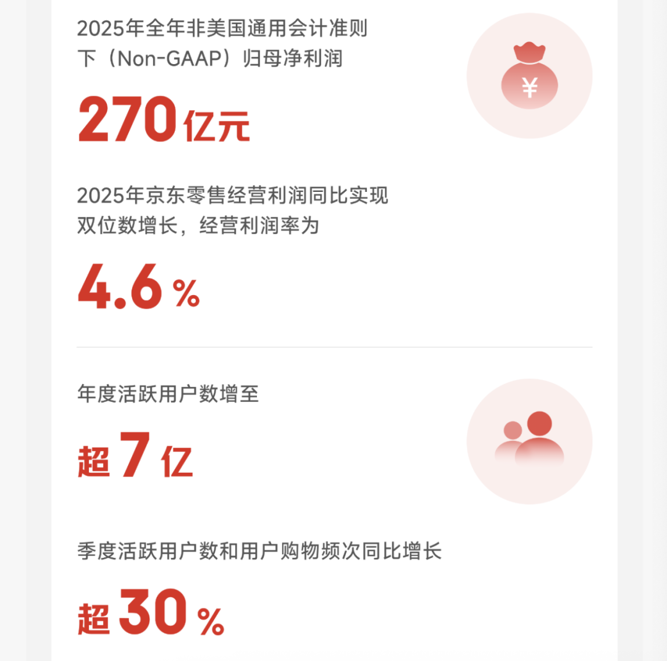 2025年非美国通用会计准则下净利润为270亿元,京东零售经营利润亦实现双位数增长,经营利润率为4.6%。