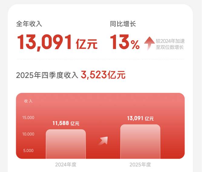 财务表现上,京东集团2025年收入达13091亿元人民币,同比增长13%,其中,服务收入同比增长23.6%,占总收入比例达21.8%,创年度新高,收入结构更加多元化。