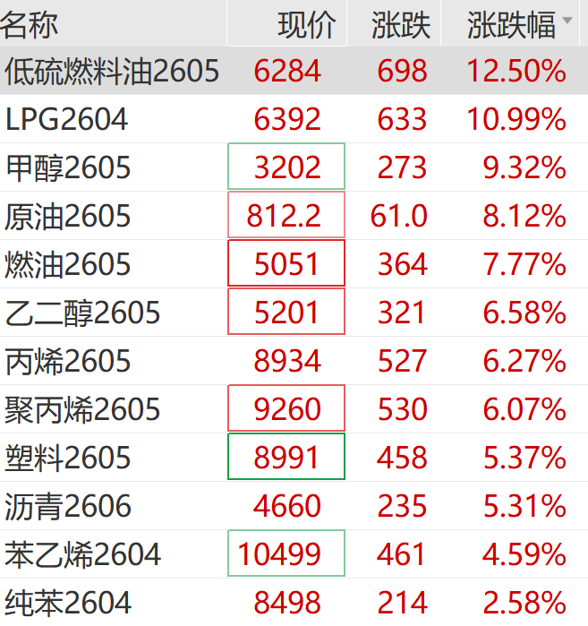 煤炭板块紧跟发力,陕西黑猫大举涨停,大有能源、陕西煤业、安泰集团、中煤能源等跟涨。电力板块直线拉升,华电辽能4连板,粤电力A、韶能股份2连板,珈伟新能涨超10%。近期,中东局势持续影响全球资本市场。据央视新闻,当地时间3月19日凌晨,卡塔尔拉斯拉凡天然气设施再次被导弹击中。稍早时候,伊朗方面消息称,伊朗再次对“驻扎有伊朗敌人的海湾国家”的石油设施发动袭击。一位美国官员及三位知情人士透露,随着美军准备采取针对伊朗行动的下一步举措,特朗普政府正考虑部署数千名美军士兵,以加强其在中东地区的军事行动。受中东冲突影响,美国汽油价格升至2023年以来最高水平,给消费者带来明显负担。据知情人士透露,美国副总统万斯及美国政府多名官员计划3月19日与石油行业高管举行会谈,以应对近期燃油价格飙升问题。3月19日,美油、布油继续走高,布油一度突破107美元/桶。国内期货市场方面,低硫燃料油、LPG、甲醇、燃油、原油、乙二醇等相关品种纷纷大涨。