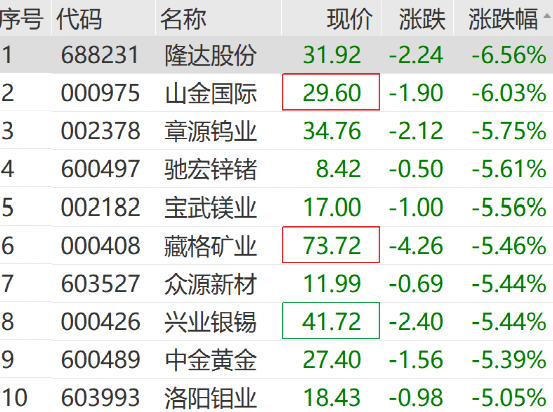 个股方面,山金国际、藏格矿业、中金黄金、洛阳钼业等大市值个股均有明显跌幅。