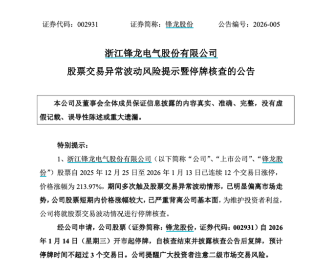 1月13日晚间,13连板的锋龙股份发布公告称,公司股票将于1月14日(星期三)开市起停牌,预计停牌时间不超过3个交易日。