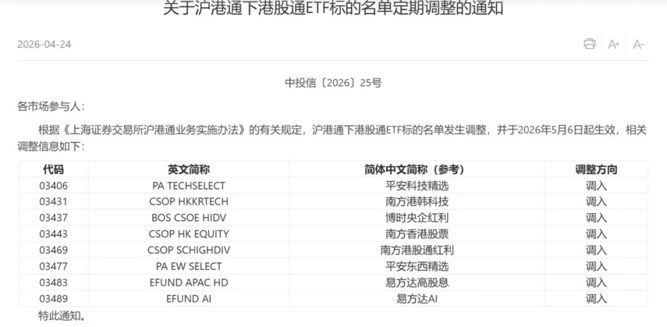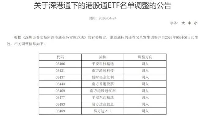 4月24日,沪深交易所发布“南向ETF通”调整名单。根据最新名单,自5月6日起,将有8只在香港上市的ETF正式纳入沪港通和深港通下的港股通ETF名单。届时,“南向ETF通”名单将由23只扩容至31只,“ETF通”的全部产品数量将由271只扩容至279只。