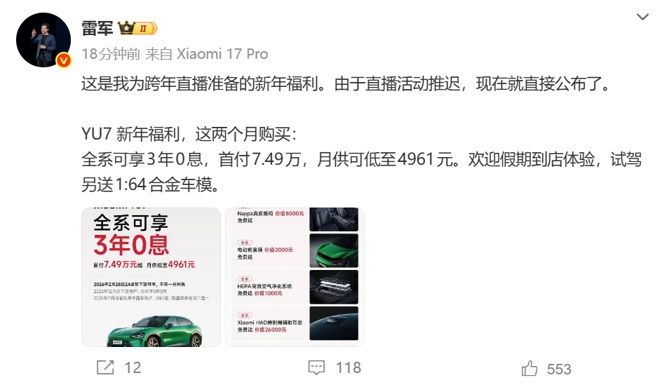 1月1日早间,雷军在微博发文称:“这是我为跨年直播准备的新年福利。由于直播活动推迟,现在就直接公布了。YU7新年福利,这两个月购买:全系可享3年0息,首付7.49万元,月供可低至4961元。欢迎假期到店体验,试驾另送1:64合金车模。”