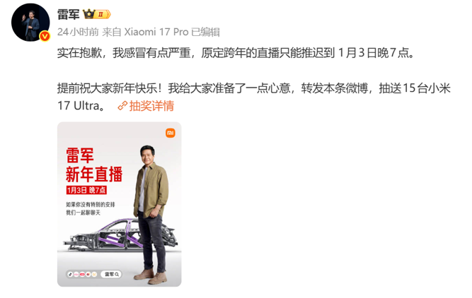 昨日上午,雷军发布微博称,由于感冒严重,原定跨年直播推迟到1月3日晚7点。
