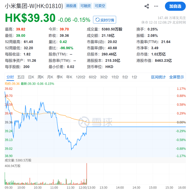 截至2025年12月31日收盘,小米汽车港股股价为39.3港元/股,总市值为1.02万亿港元。