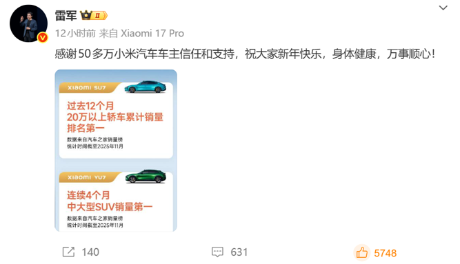 另外,昨日雷军发布图片显示,过去12个月,小米SU7在20万元以上汽车中累计销量排名第一;小米YU7连续4个月在中大型SUV中销量第一(统计时间截至2025年11月)。