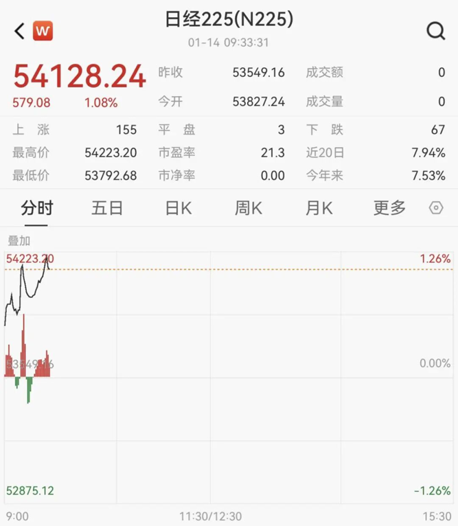 1月14日,日经225指数开盘走高,首次触及54000点,涨幅为1%,再创新高。