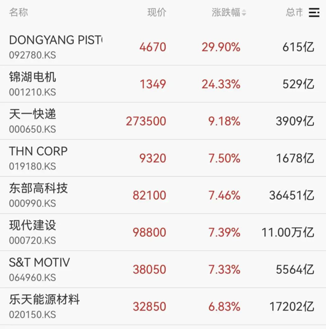 个股方面,天一快递、现代建设、乐天能源材料等涨幅居前。