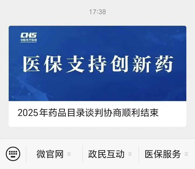 11月4日17时许,国家医保局官方微信号发布了题为《2025年药品目录谈判协商顺利结束》、配图提示文字为“医保支持创新药”的文章。