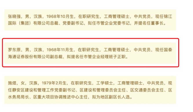 【导读】国泰海通副总裁罗东原拟任上海市管企业经理班子正职