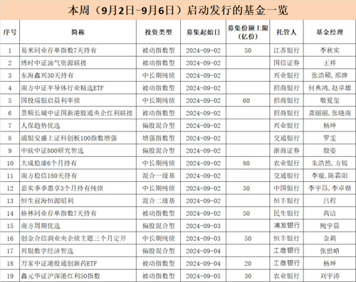 本周(9月2日至9月6日),全市场共有19只新基金(仅统计主代码,下同)面市。其中,债券型基金、被动指数型基金依然是主力。在A股持续震荡的背景下,风险较低的固收产品和作为重要配置工具的指数产品受到资金青睐,同时也是基金公司的布局重点。