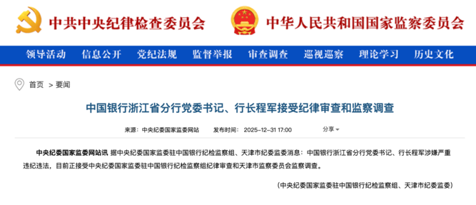 12月31日,中央纪委国家监委网站发布消息称,据中央纪委国家监委驻中国银行纪检监察组、天津市纪委监委消息:中国银行浙江省分行党委书记、行长程军涉嫌严重违纪违法,目前正接受中央纪委国家监委驻中国银行纪检监察组纪律审查和天津市监察委员会监察调查。