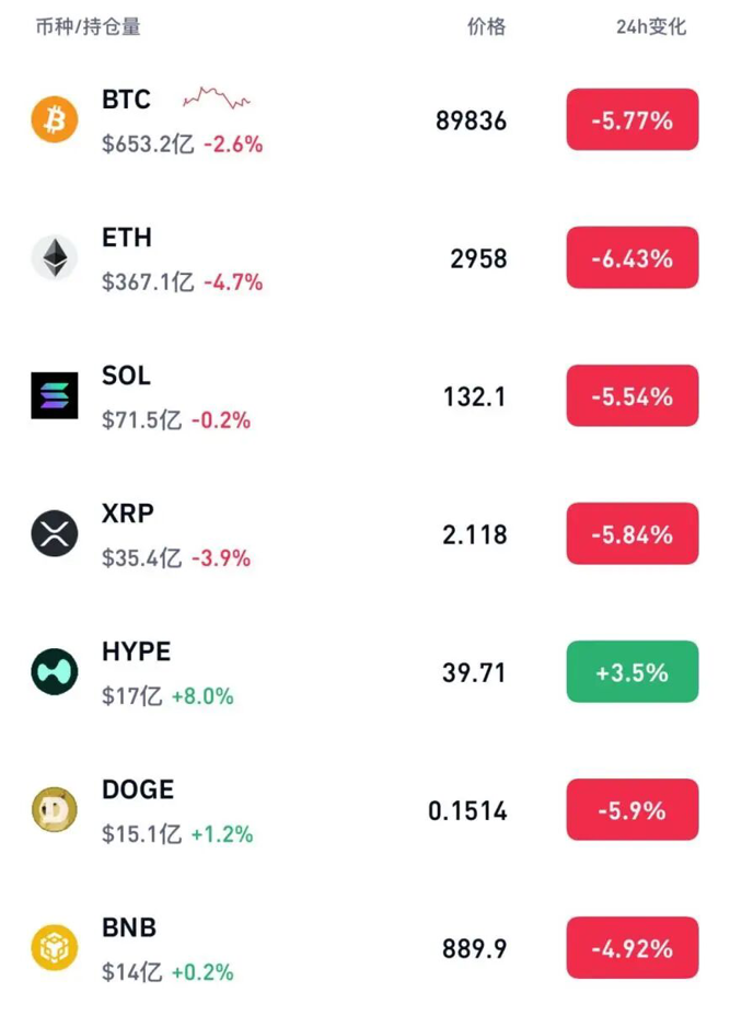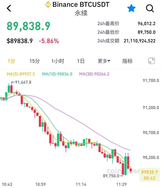 截至发稿,比特币报89838.9美元/枚,24小时内最低报89750美元/枚,日内跌幅达5.86%。