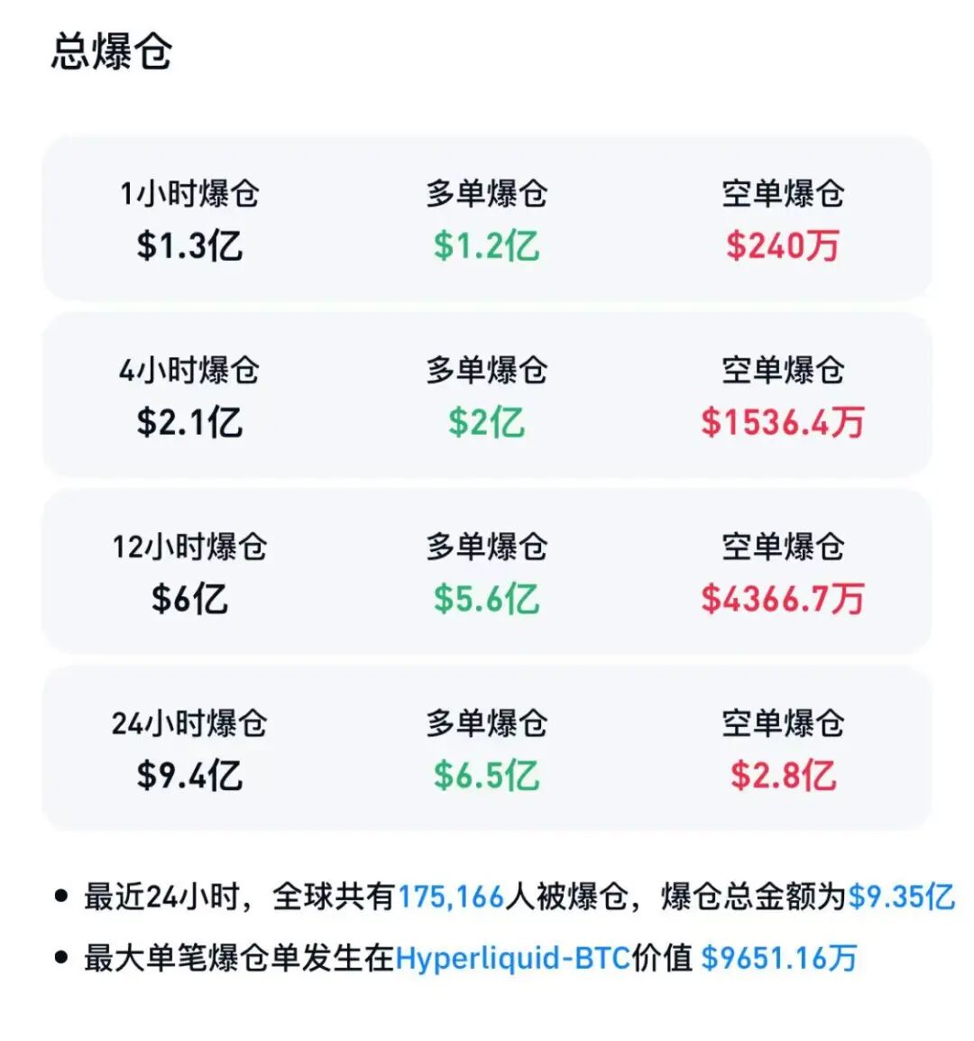 Coinglass数据显示,过去24小时加密货币市场共有超17.5万人被爆仓,爆仓总金额为9.35亿美元,其中多单爆仓6.5亿美元,空单爆仓2.8亿美元。