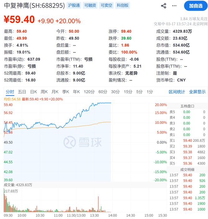 中复神鹰午后走高,封住20cm涨停,报59.4元/股。