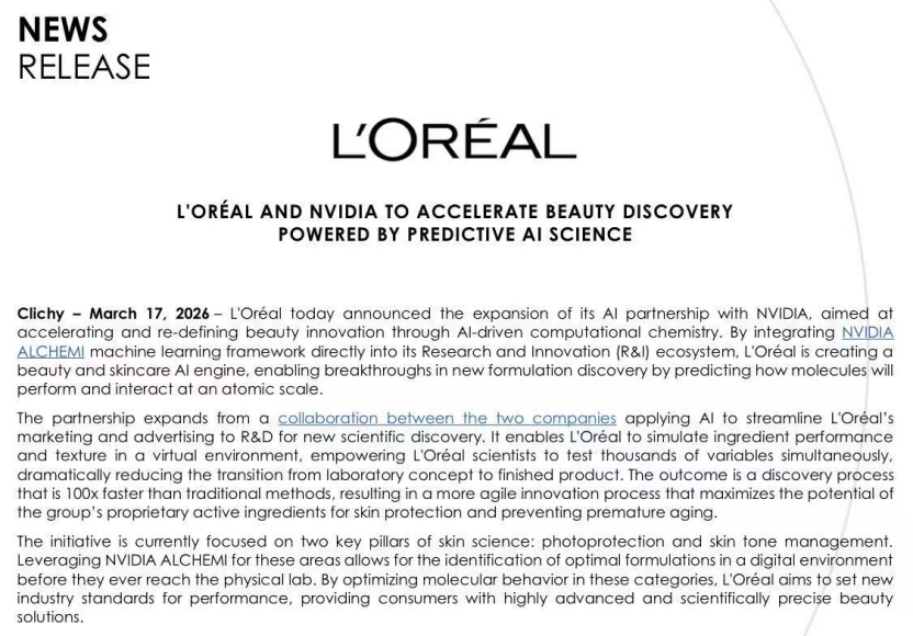 行业龙头欧莱雅与AI芯片巨头英伟达宣布扩大全球战略合作,联合打造专属美妆护肤AI引擎,实现化妆品配方研发的原子级精准探索,推动研发效率实现百倍级提升。