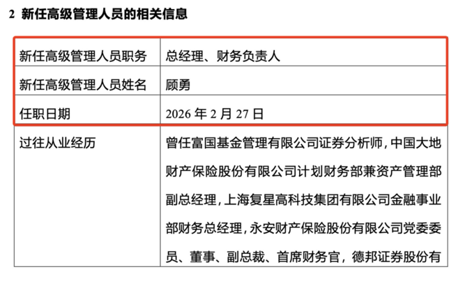 2026年2月27日晚间,东财基金宣布,原副总经理顾勇正式出任总经理、财务负责人,原总经理沙福贵因工作安排离任。顾勇于2025年3月出任东财基金副总经理,时隔不到一年便“接棒”总经理一职。