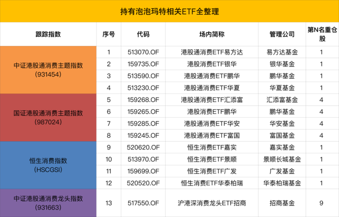 在众多相关指数中,ETF君筛选出了4只持有泡泡玛特的代表性指数: