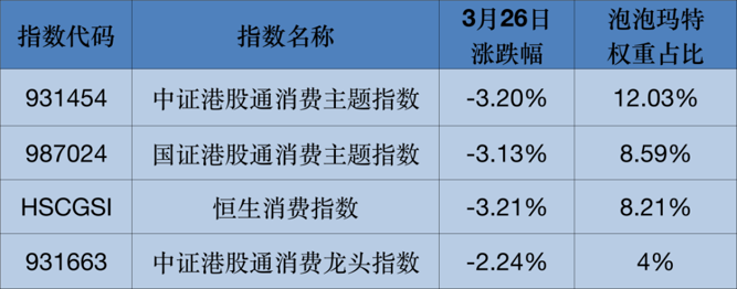以下是这4只指数3月26日跌幅情况以及泡泡玛特权重占比: