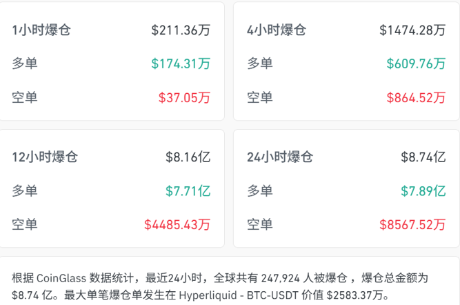 加密货币市场全线走低,SOL、DOGE、SUI等均有明显跌幅。CoinGlass数据显示,最近24小时,全球共有24.79万人被爆仓,爆仓总金额为8.74亿美元。
