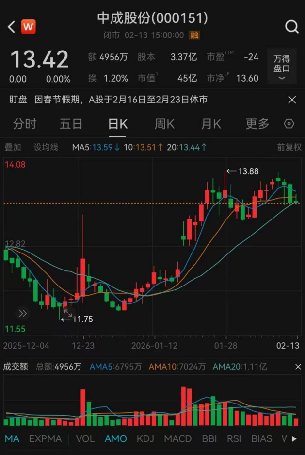 截至2月13日收盘,中成股份报13.42元/股,总市值为45亿元。