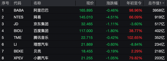 中概股普跌,纳斯达克中国金龙指数收跌0.93%。个股方面,网易跌4.51%,京东集团、百度集团、小鹏汽车跌超1%,阿里巴巴跌0.46%。