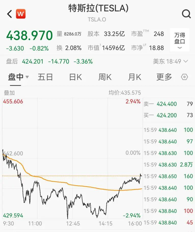 受盈利未达预期及成本和政策压力等因素影响,特斯拉股价盘后跌超3%,报424.201美元/股。
