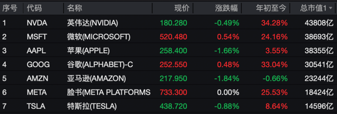 大型科技股多数下跌,万得美国科技七巨头指数跌0.51%,亚马逊跌1.84%,苹果跌1.66%,特斯拉跌0.88%,英伟达跌0.49%。