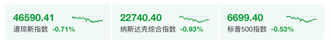 美国三大股指全线下跌。截至收盘,道指跌0.71%,标普500指数跌0.53%,纳指跌0.93%。
