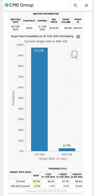 具体来看,目前美联储10月维持利率不变的概率为2.7%,降息25个基点的概率为97.3%;美联储12月维持利率不变概率为0%,累计降息25个基点的概率为4.4%,累计降息50个基点的概率为95.5%。