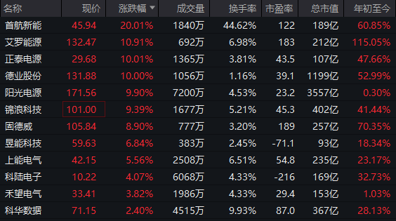光伏产业链爆发,首航新能实现20%涨停;正泰电源、德业股份涨停,阳光电源、亿纬锂能均涨超9%。