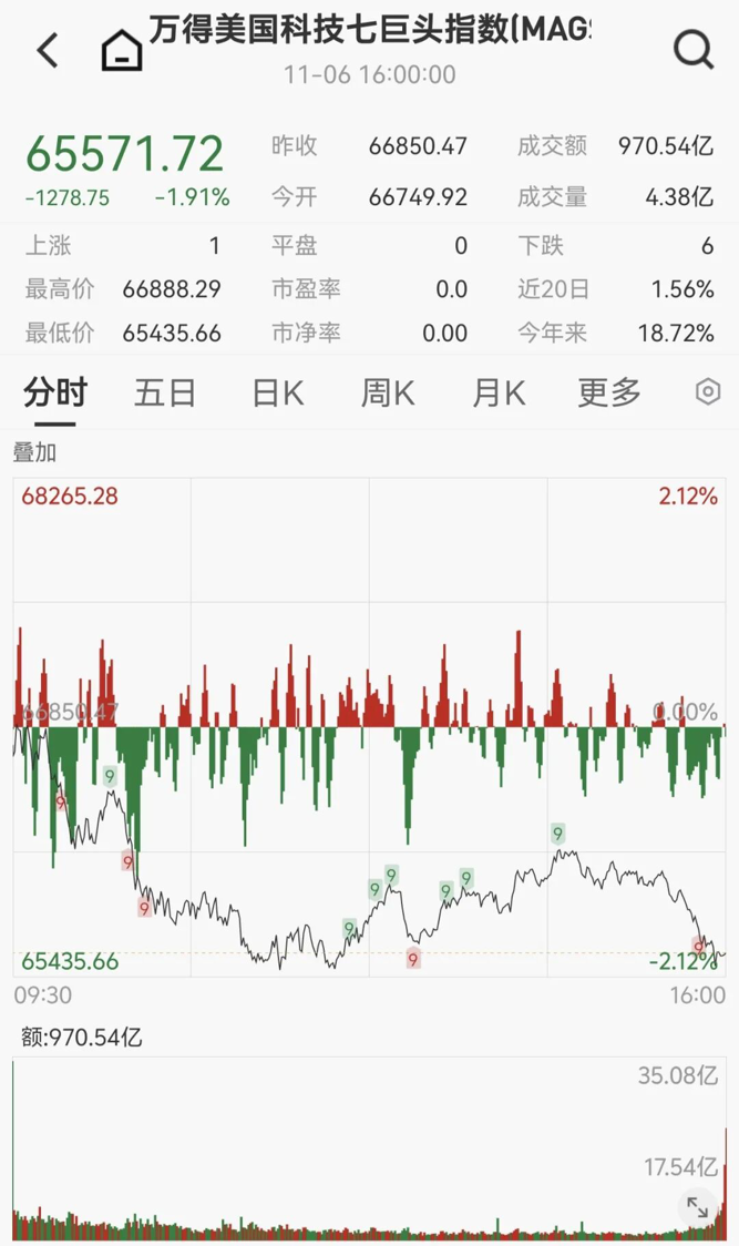 万得美国科技七巨头指数一度大跌2.12%,收盘时跌1.91%。