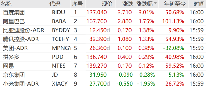 百度集团涨3.01%,阿里巴巴涨1.75%,比亚迪涨1.38%,领涨万得中概科技龙头指数成份股。今年以来阿里巴巴股价涨幅高达101.13%!