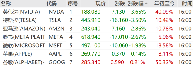 美国科技七巨头几乎全线下跌,英伟达跌3.65%,特斯拉跌3.50%,亚马逊跌2.86%,领跌七巨头,仅谷歌微涨0.21%。