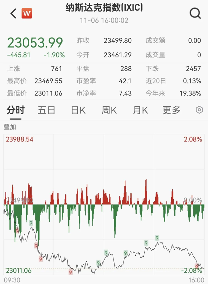 11月6日,美国三大股指全线收跌,美国科技股大跌,中概龙头股逆市上涨。国际贵金属期货普遍收跌。