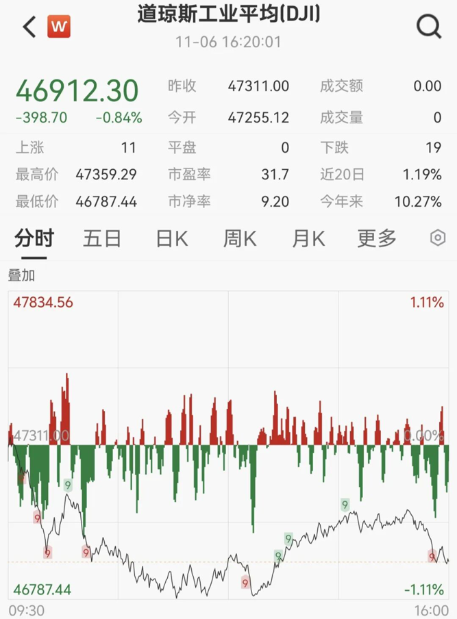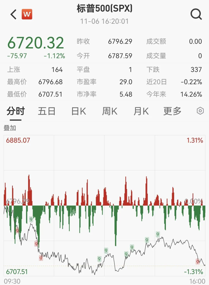 美国三大股指全线收跌,道指跌0.84%,报46912.3点;标普500指数跌1.12%,报6720.32点;纳指跌1.9%,报23053.99点。