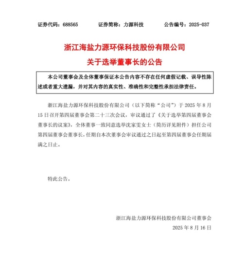 近日,力源科技公告称,公司于2025年8月15日召开第四届董事会第二十三次会议,审议通过了《关于选举第四届董事会董事长的议案》,全体董事一致同意选举沈家雯担任公司第四届董事会董事长,任期自本次董事会审议通过之日起至第四届董事会任期届满之日止。