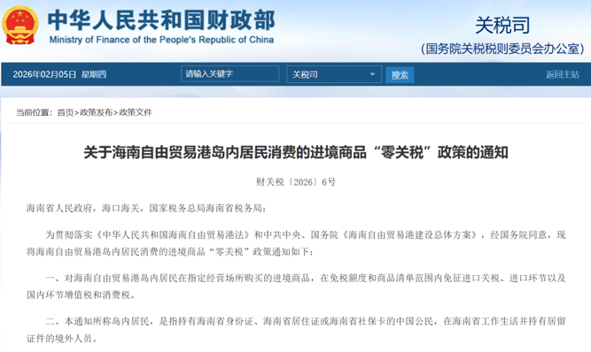 2月5日,财政部、海关总署、税务总局三部门联合印发《关于海南自由贸易港岛内居民消费的进境商品“零关税”政策的通知》(以下简称《通知》),自公布之日起实施。