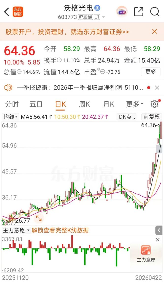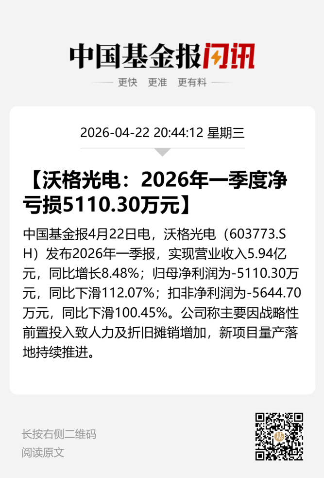 4月22日晚间,商业航天大牛股沃格光电(证券代码:603773)披露2025年年报和2026年一季报。这份成绩单与公司近期“10天6板”的市场热度形成强烈反差:营收稳步增长,但亏损持续扩大,业绩承压显著。