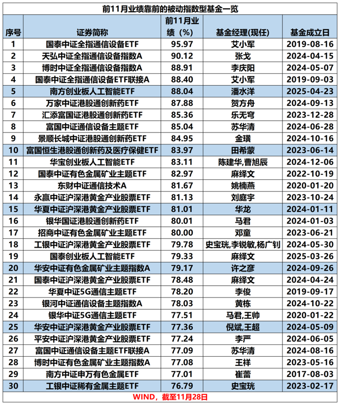 今年前11月,通信设备、创新药、有色金属等板块轮番演绎,带动一大批指数基金的表现。从具体指数基金表现来看,通信设备主题指数基金成为前11月最大赢家。