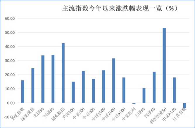 具体来看,主流指数前11月基本维持上涨行情,其中科创创业50、创业板指等指数表现神勇,年内涨幅均超40%,分别达到53.17%、42.54%;科创50、北证50、中证2000等指数也表现强势,涨幅超30%。不过,中证红利指数、红利指数出现小幅下跌。