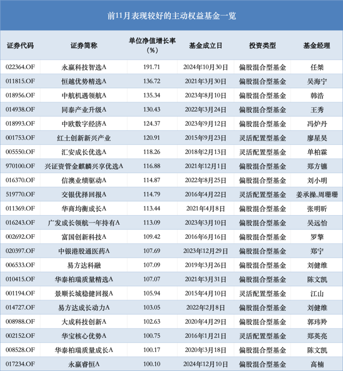 【导读】前11月主动权益基金平均业绩超27%,38只“翻倍基”,最牛超190%