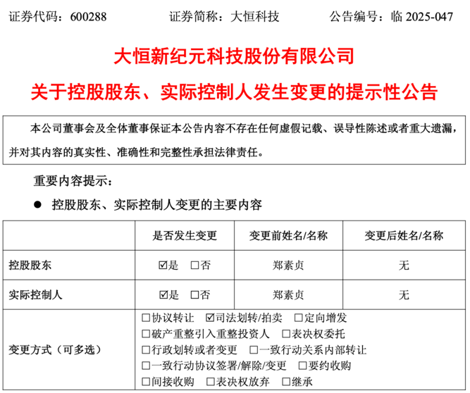 大恒科技称,公司将变更为无控股股东、无实际控制人。本次控制权变更属于执行法院裁定,不触及要约收购。
