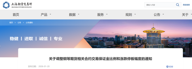 1月20日,上海期货交易所(以下简称上期所)发布通知,调整铜、铝、黄金、白银等期货相关合约交易保证金比例和涨跌停板幅度。