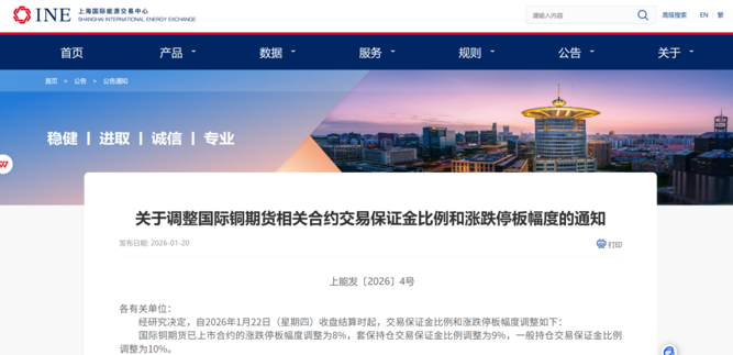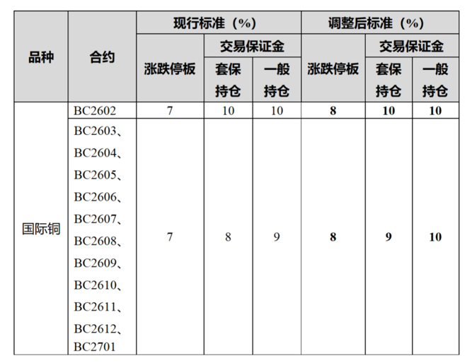 根据通知,自1月22日(星期四)收盘结算时起,国际铜期货已上市合约的涨跌停板幅度调整为8%,一般持仓交易保证金比例调整为10%。BC2602的套保持仓交易保证金比例调整为10%,其余合约的套保持仓交易保证金比例调整为9%。