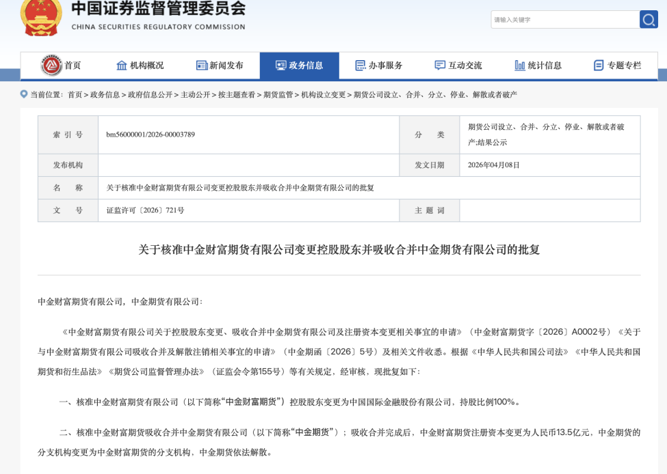 4月9日,中国证监会官网公布《关于核准中金财富期货有限公司变更控股股东并吸收合并中金期货有限公司的批复》,核准中金财富期货控股股东变更为中金公司,持股比例为100%;同时核准中金财富期货吸收合并中金期货。