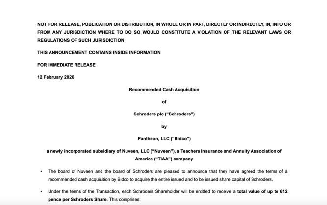 Nuveen将以现金收购施罗德全部已发行和待发行的股本。根据交易条款,每位施罗德股东将有权以每股最多获得612便士,包括现金对价590便士以及最多22便士的股息红利。