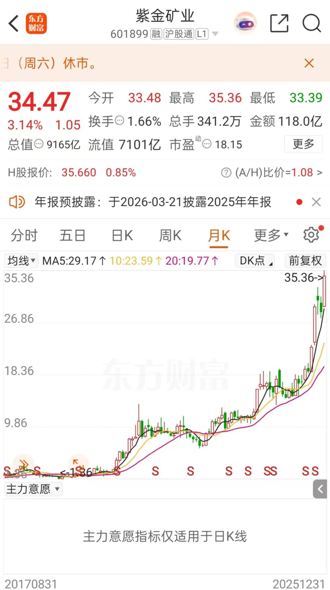 受优秀业绩刺激,紫金矿业A股股价在2025年最后一个交易日大涨3.14%,报收于34.47元/股,总市值超9000亿元,再创历史新高。